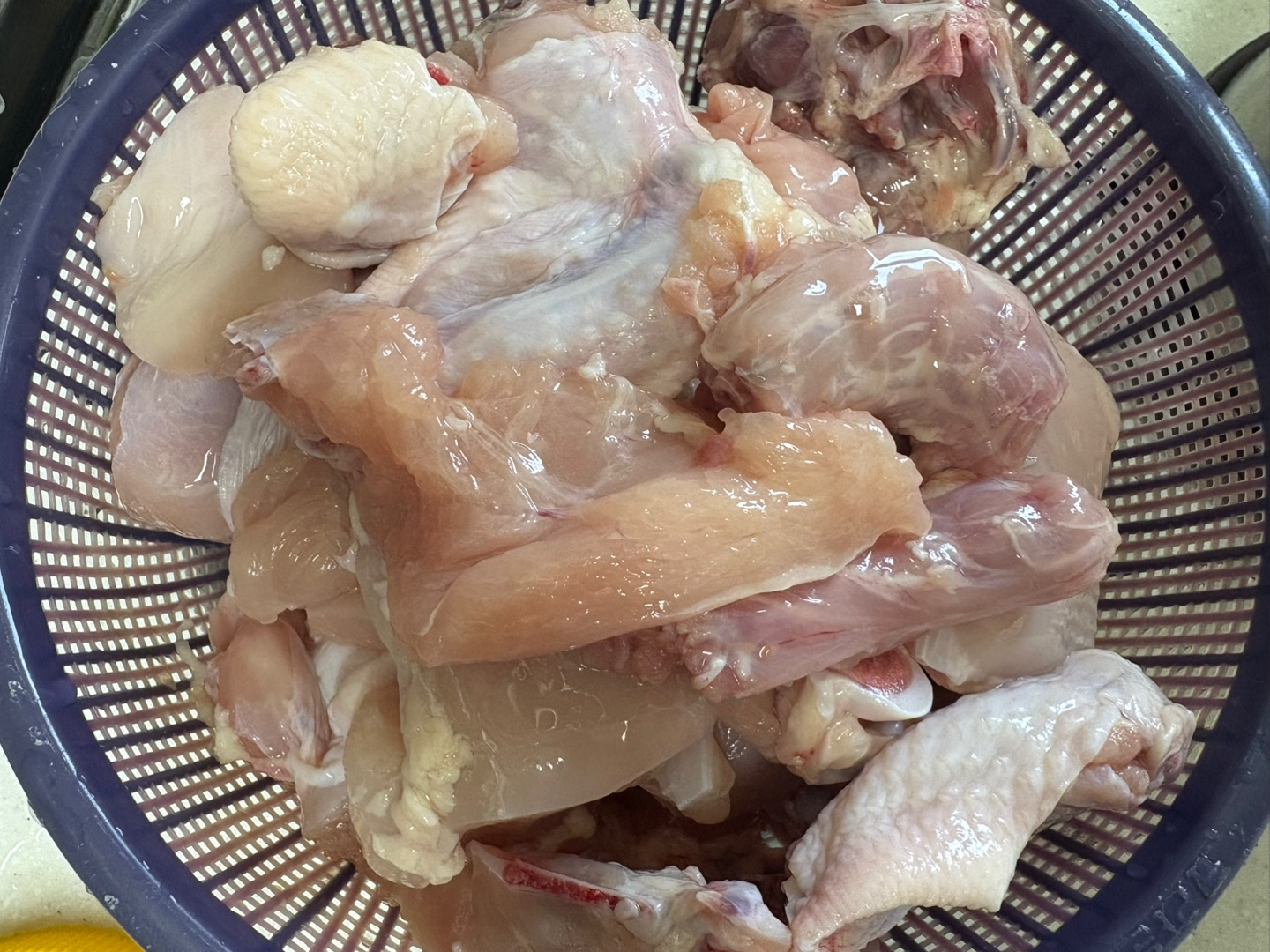 우유가 없어서 따로 잡내는 못 뺐고 최소한의 핏물 제거를 위해 물에 세척하고 물기 한 30분 빼줬어요. 키친타올로 물기 닦으면 한도끝도 없으니 그냥 저렇게 체에 받쳐 물기 제거하는 걸 추천합니다~