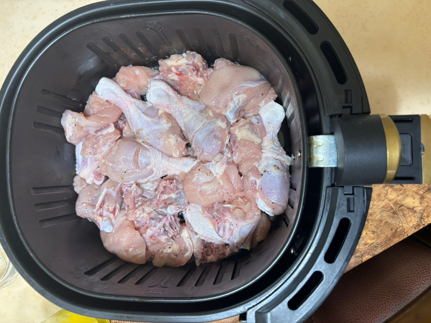 에어프라이어 크기에 비해 닭 양이 많긴 하지만 뼈 있는 부분은 추가로 더 익힐 생각으로 저렇게 쌓을 수밖에 없었어요 ㅜㅜ