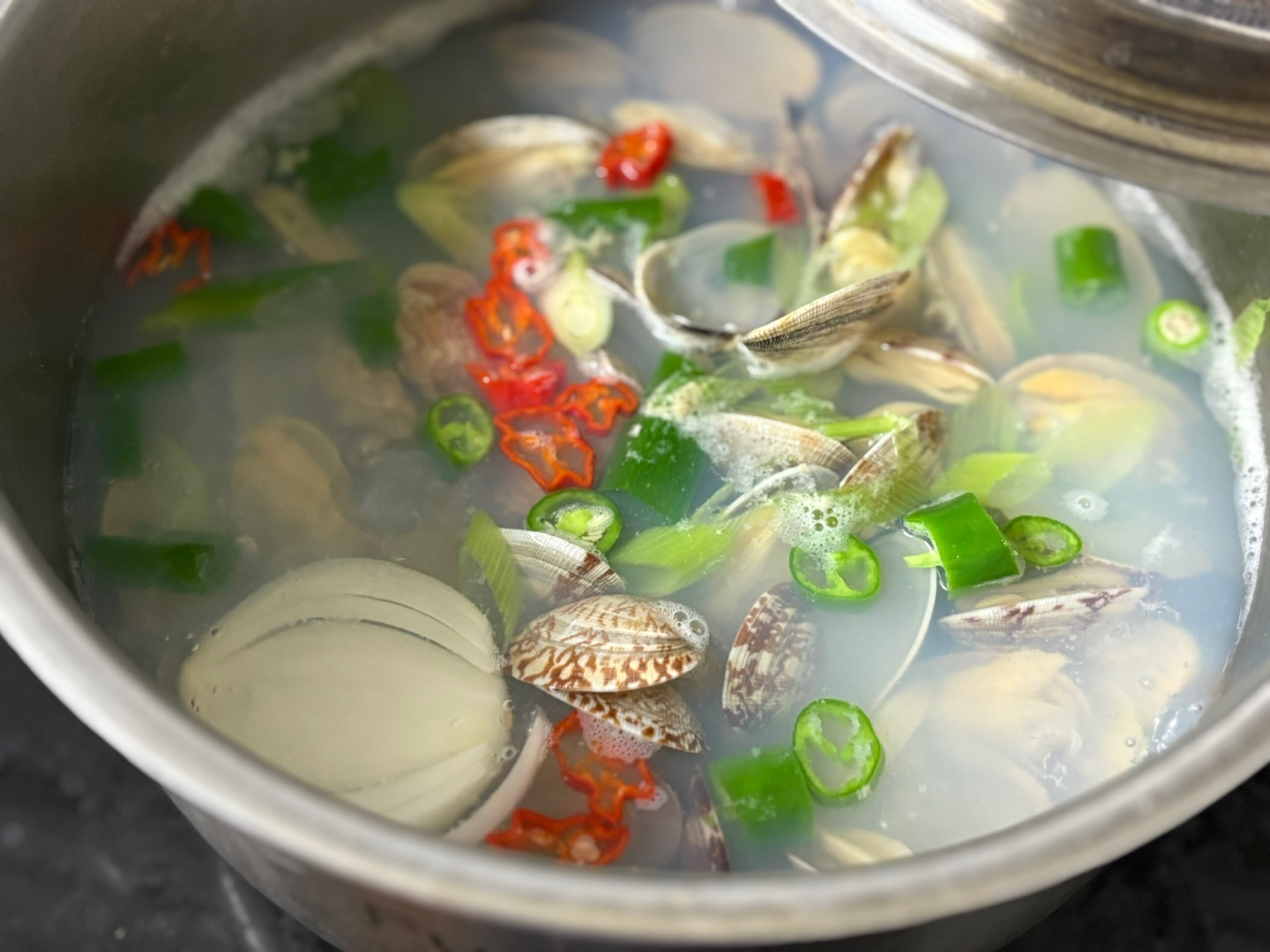 이어서 바로 끓는 물에 바지락 투하~