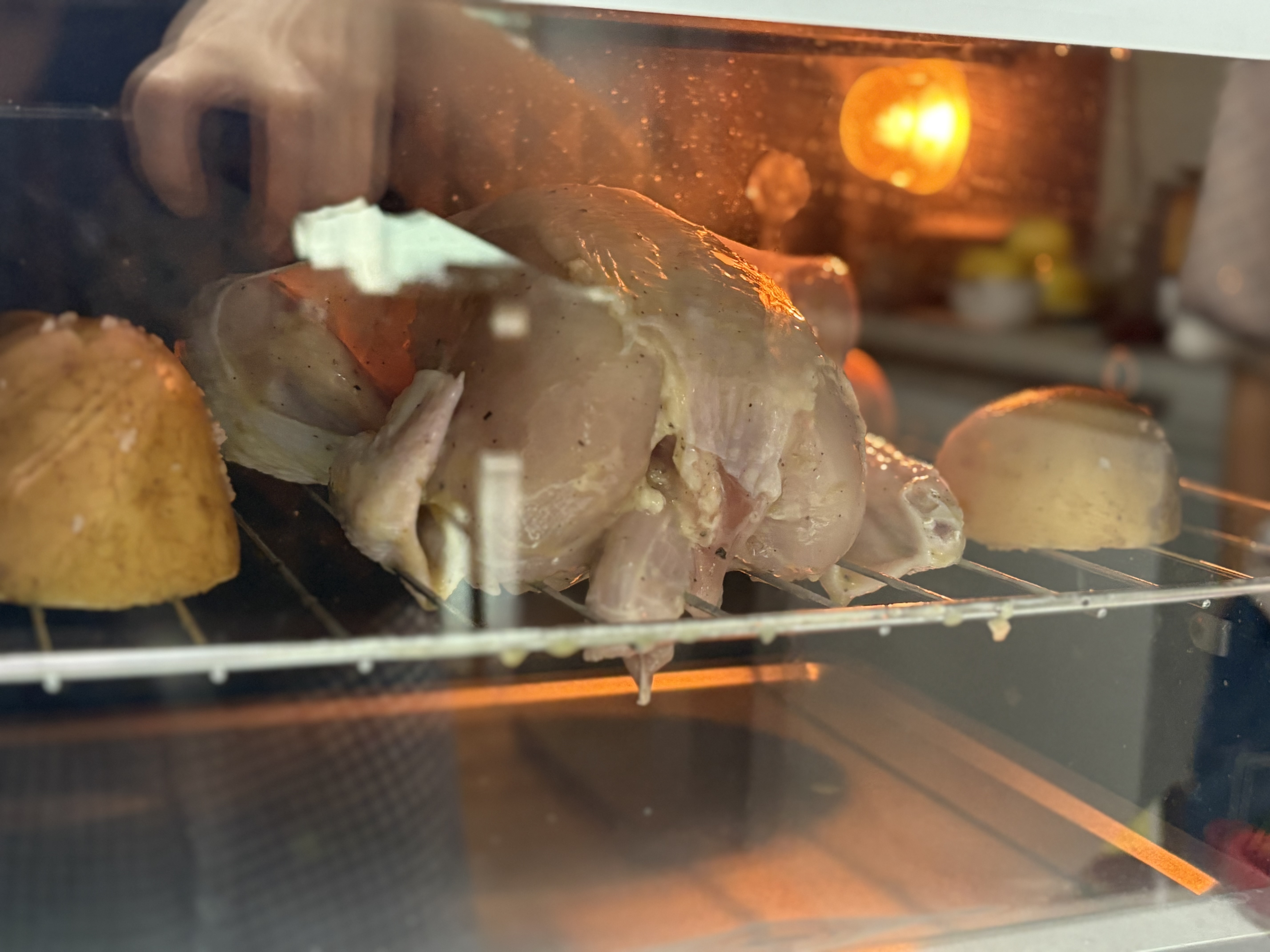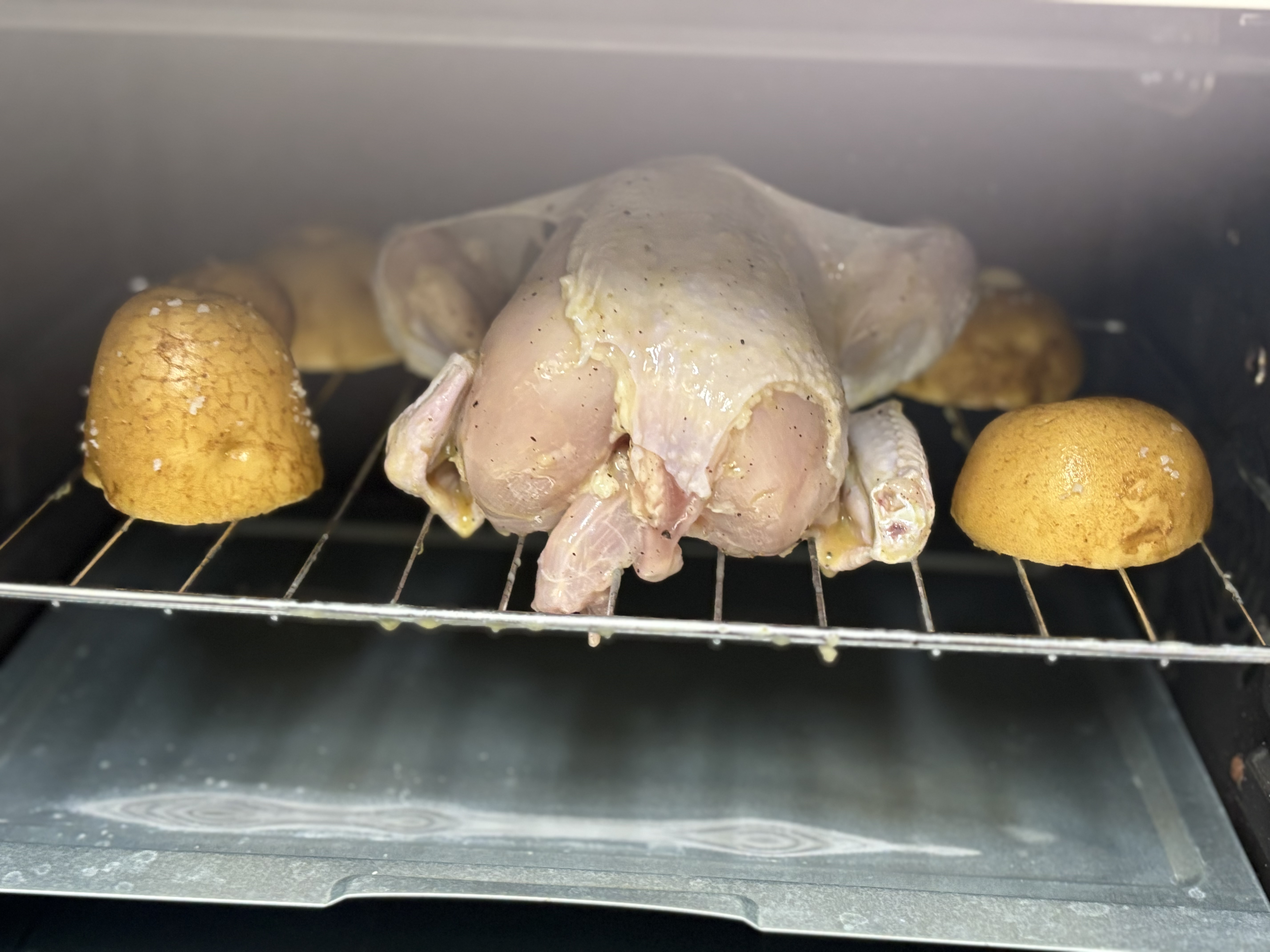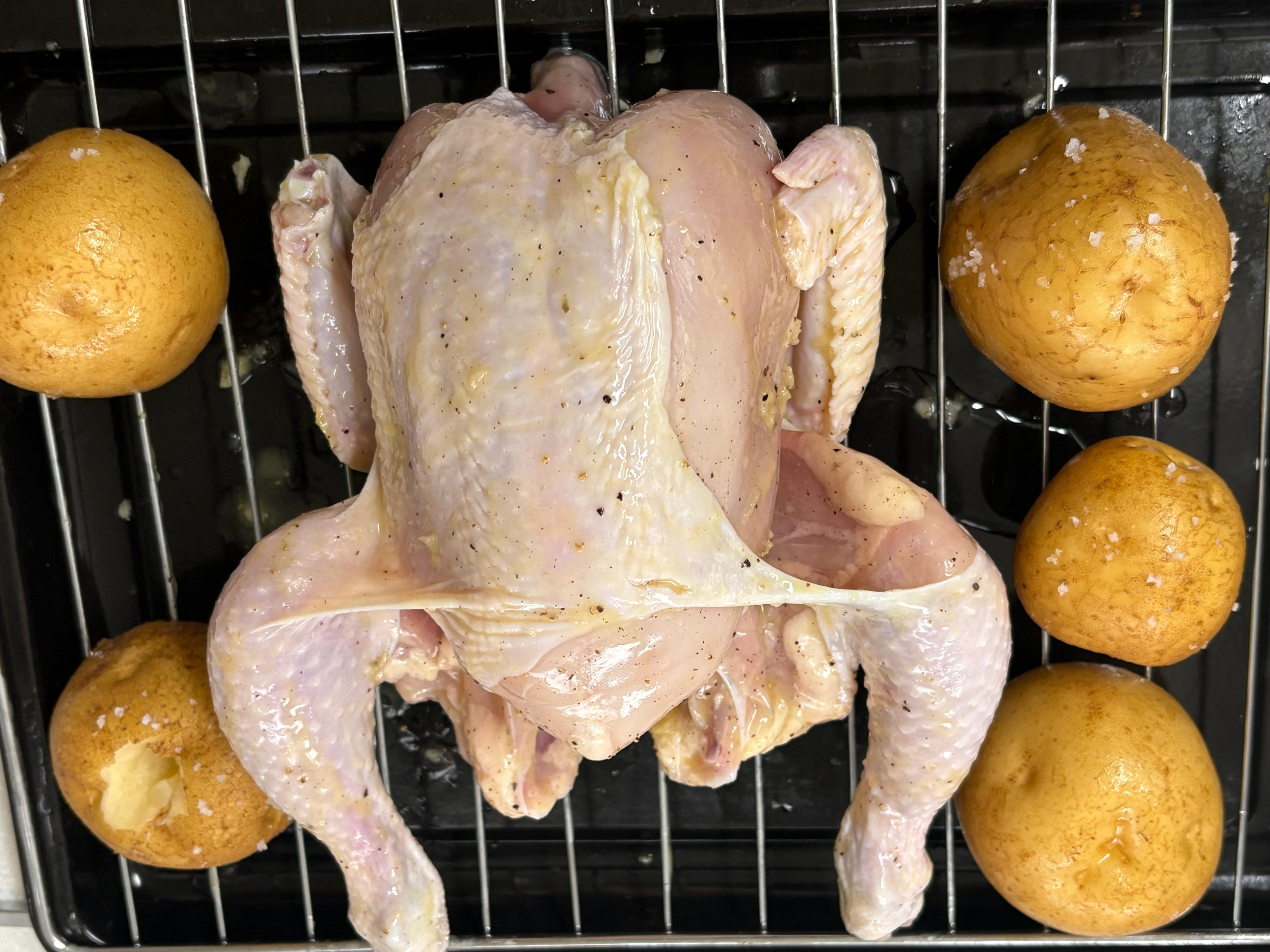 넓은 곳에 닭만 놓기 허전해서 통감자 반으로 갈라 위에 왕소금 뿌려서 같이 넣어주려구요!