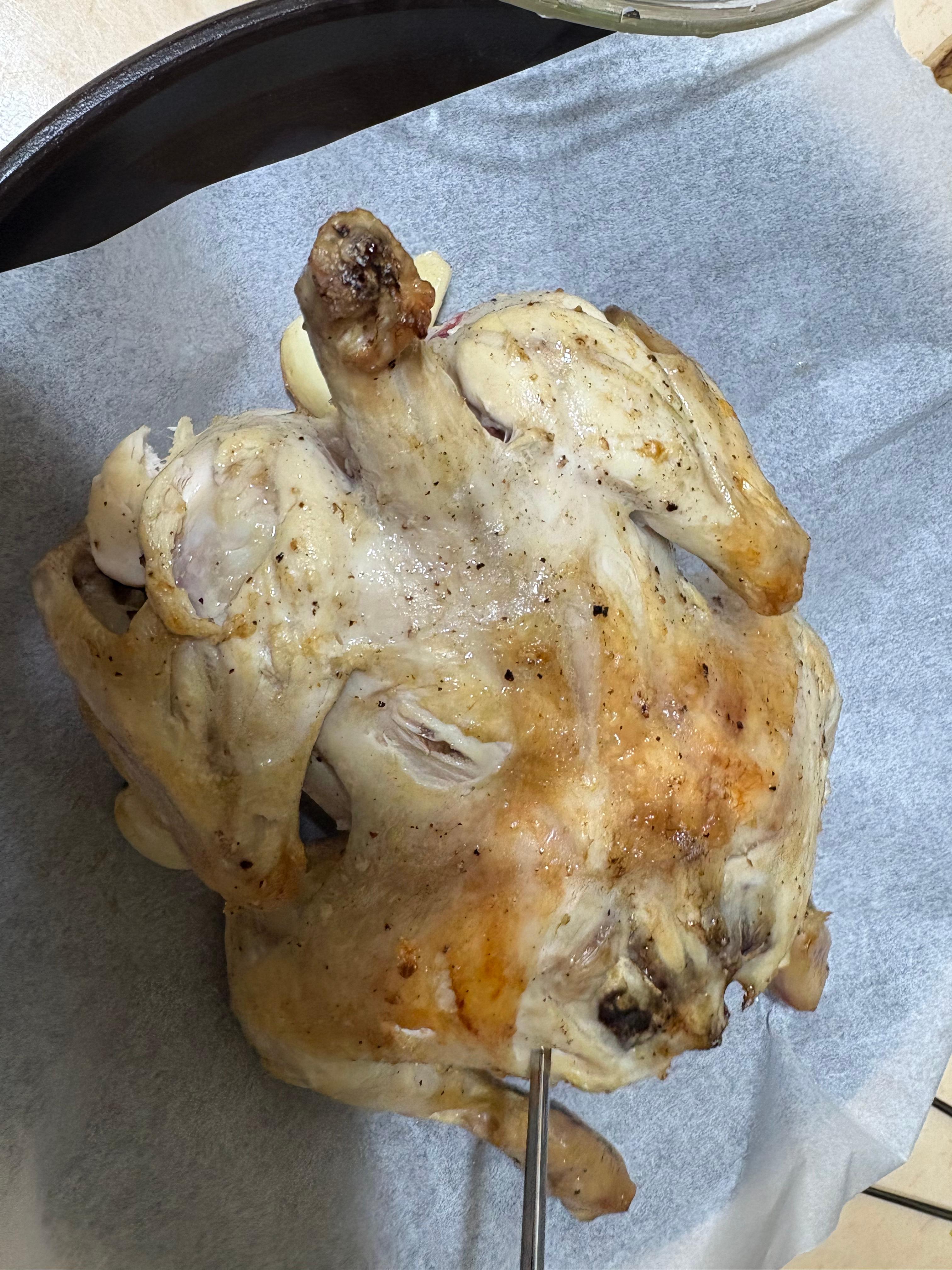45분 쯤 됐을 때 상태입니다. 겉은 노릇노릇해졌으나 안에 뼈 부분에는 아직 피가 고이는 경우가 있어 거의 탈 정도로 바싹 익혀주는 것이 중요해요. 저는 오븐형 에어프라이어에 처음 넣어서 익혀줬다가 생각보다 진전이 ,...없어 원래 원통형 에어프라이어로 옮겨 바삭 익혀주었어요~