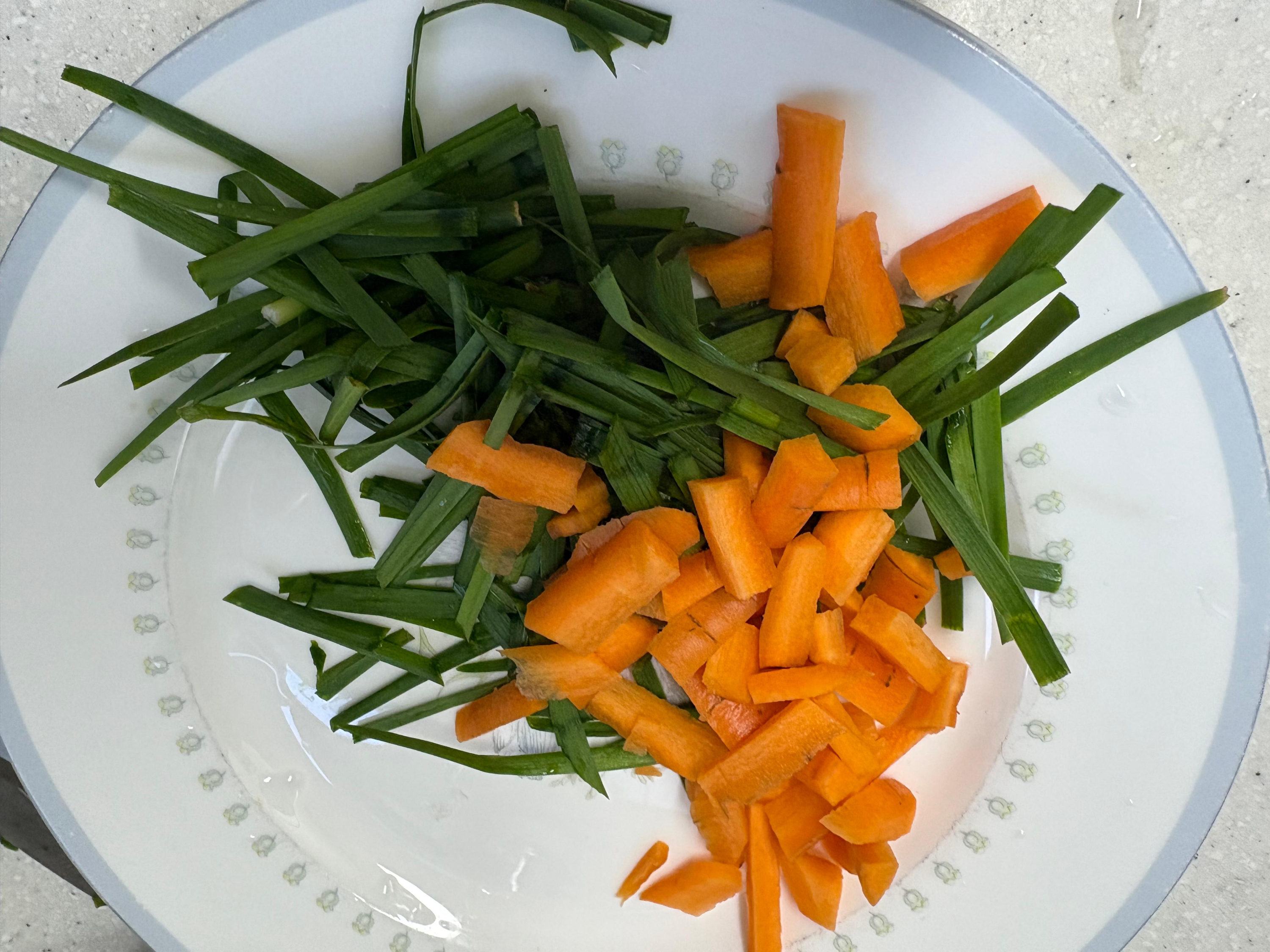 재료 : 숙주, 계란, 밥 한공기, 부추, 당근, 쪽파, (칵테일) 새우, 다진마늘, 양파