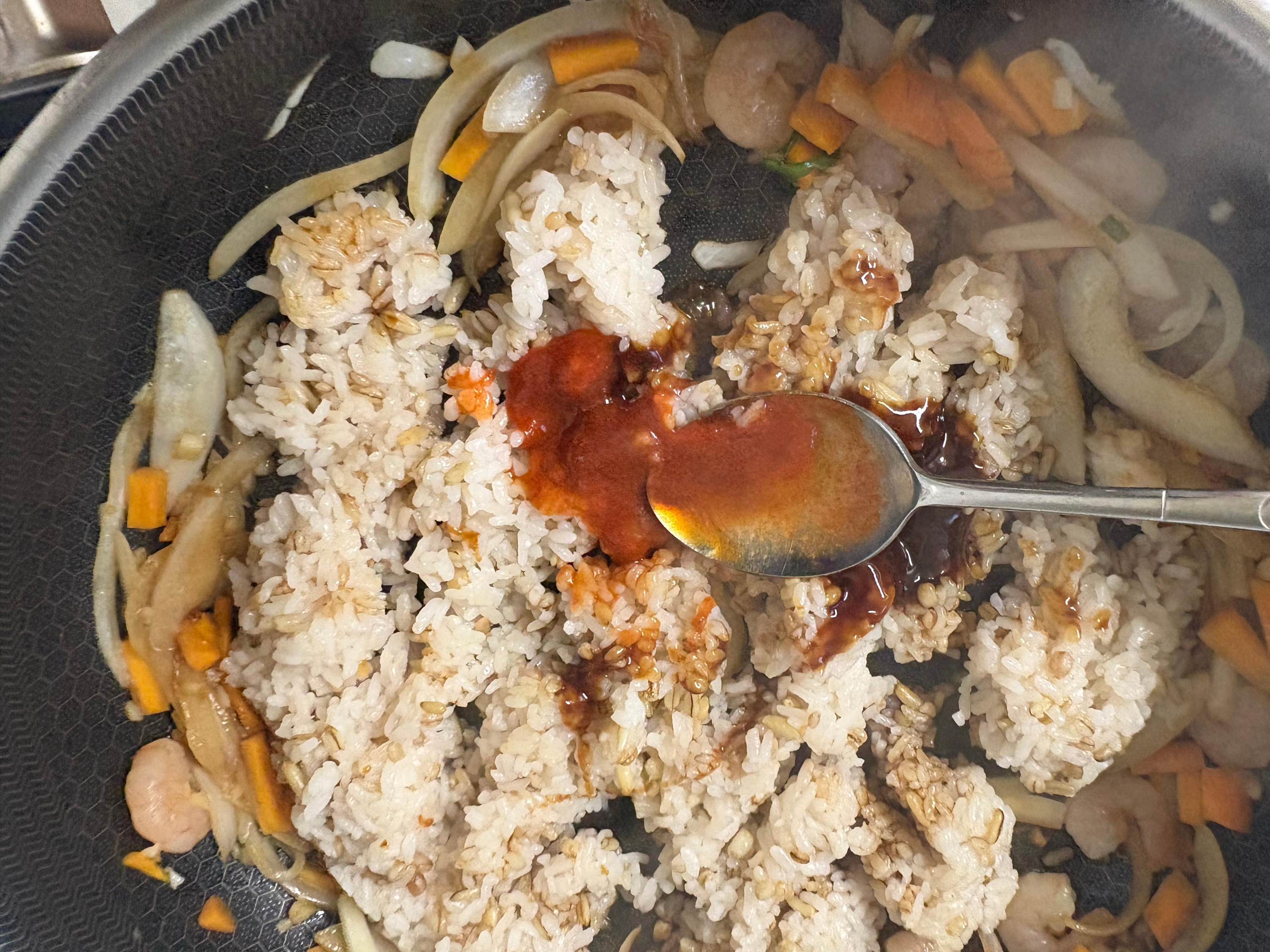 달군 팬에 식용유 조금 두르고 양파랑 마늘 당근 새우 센불로 확 볶아주기