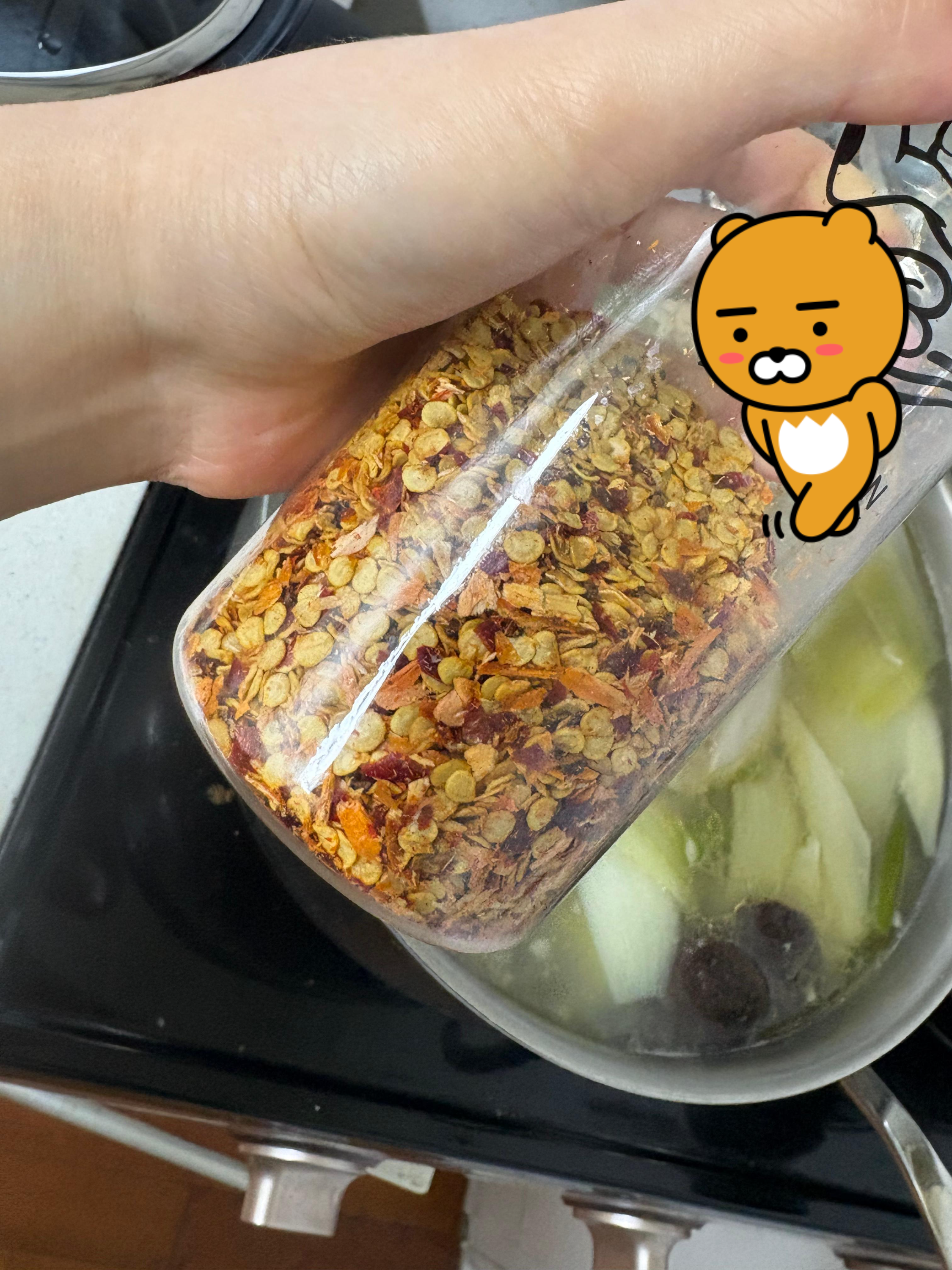 동생 친구 아주머니(?)가 주신 고추씨가 있길래 넣으면 칼칼하니 맛있어진다길래 한 스푼 넣어줬구요. 과연 자연스러운 얼큰한 맛이 가능할쥐...