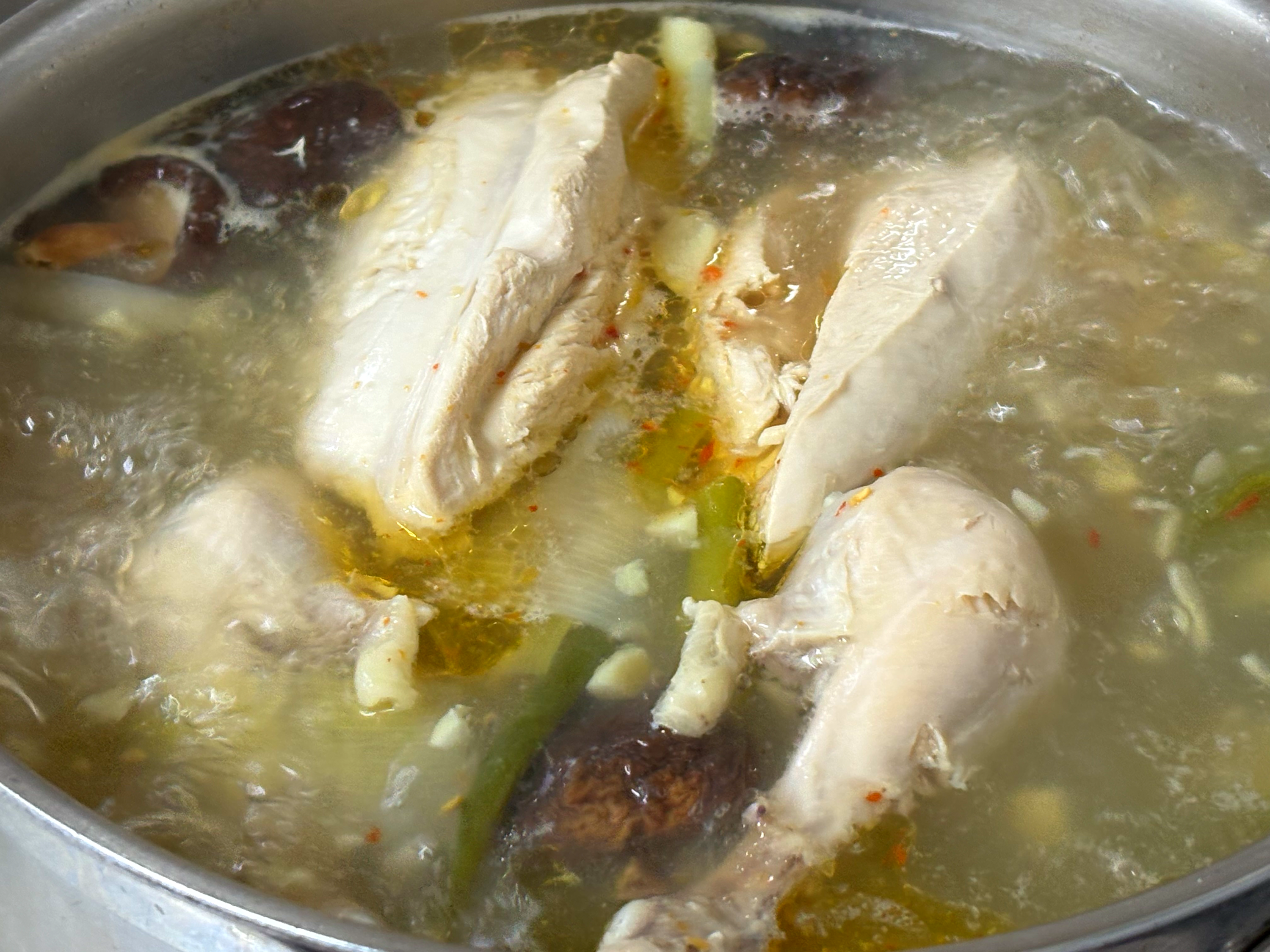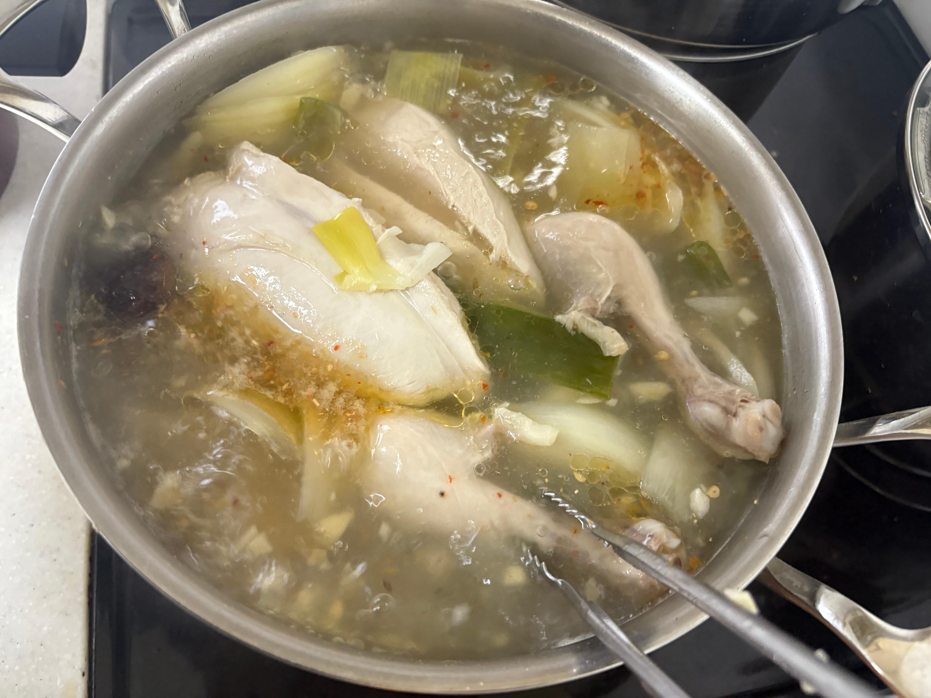 닭이 들어가서 끓으면 물이 흘러넘칠 거 같기에 국물 한 대접 덜어냈어요.