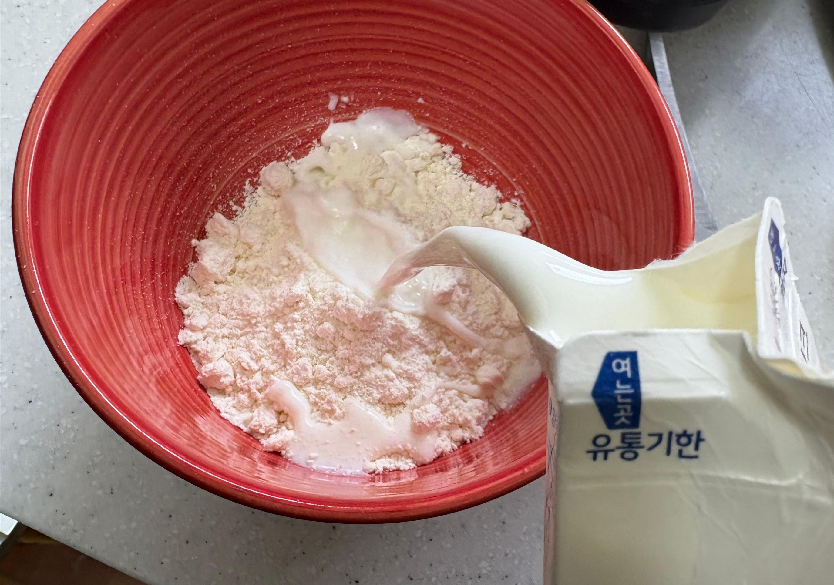그리고 우유를 부어가며 적당히 점도 있게 만들어서 섞어줄게요