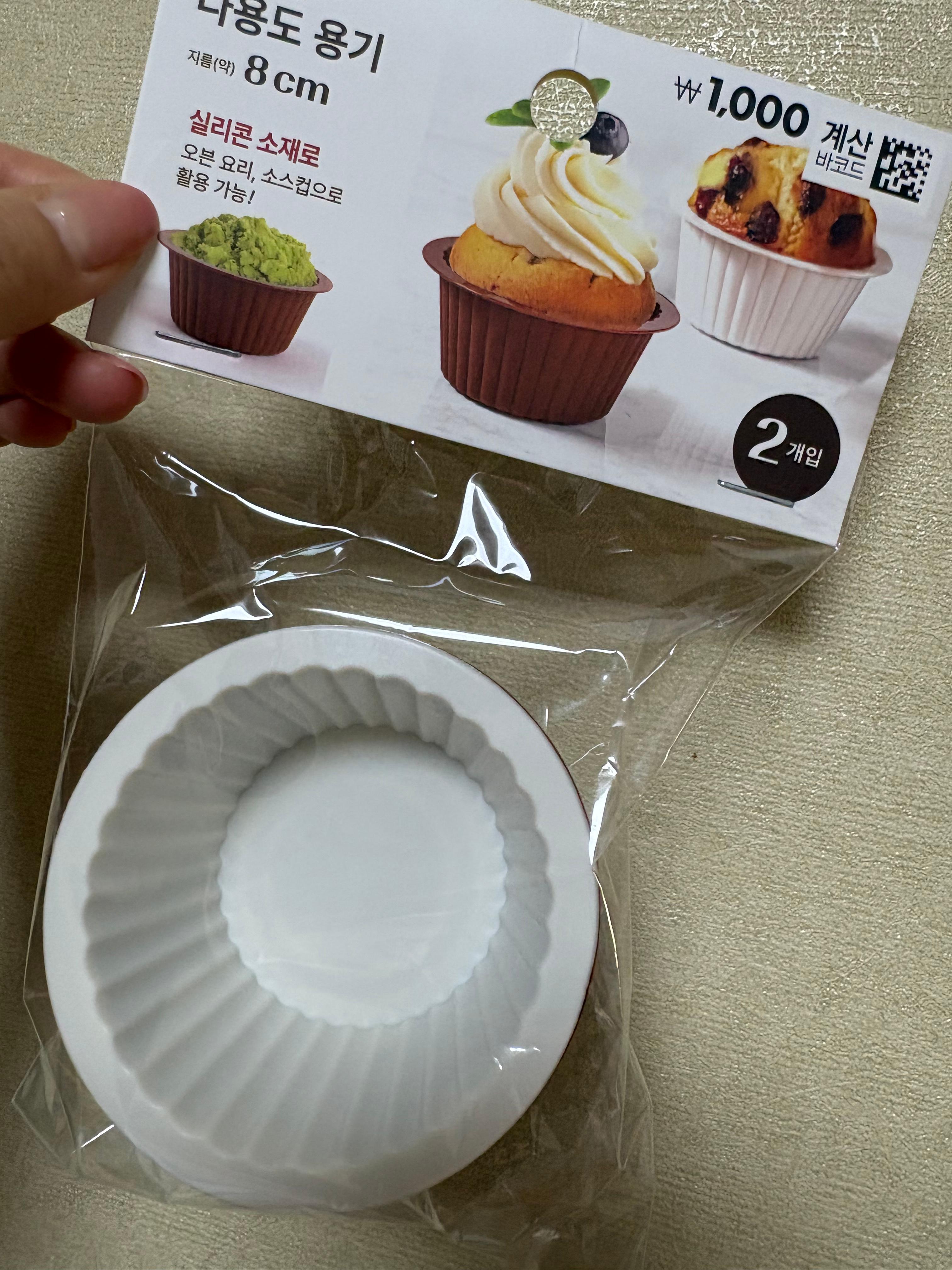 이렇게 소스컵으로도 사용가능한 실리콘 다용도 용기를 팔아요. 다이소에서 천원에 구매했고 틀은 두 개 가 들어가있어요!